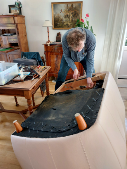 Een techneut van Ruilkring Hogeland, waarvan ik lid ben, bood uitkomst. Weer gebeurde er een wonder: de veer werd gerepareerd. Het herstelde bankje ging naar de kringloop